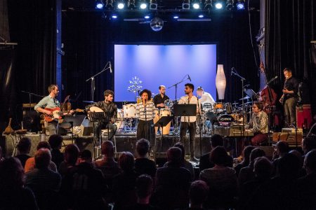 Foto door: Maarten Mooijman. Gezamelijke productie SupeRRosa, een gezamenlijke productie van het Rosa ensemble en Catching Cultures Orchestra, is na een reeks van ontwikkelings- en oefensessies tot stand gekomen. SupeRRosa bestaat voor de helft uit Rosa musici, Jeroen Kimman -